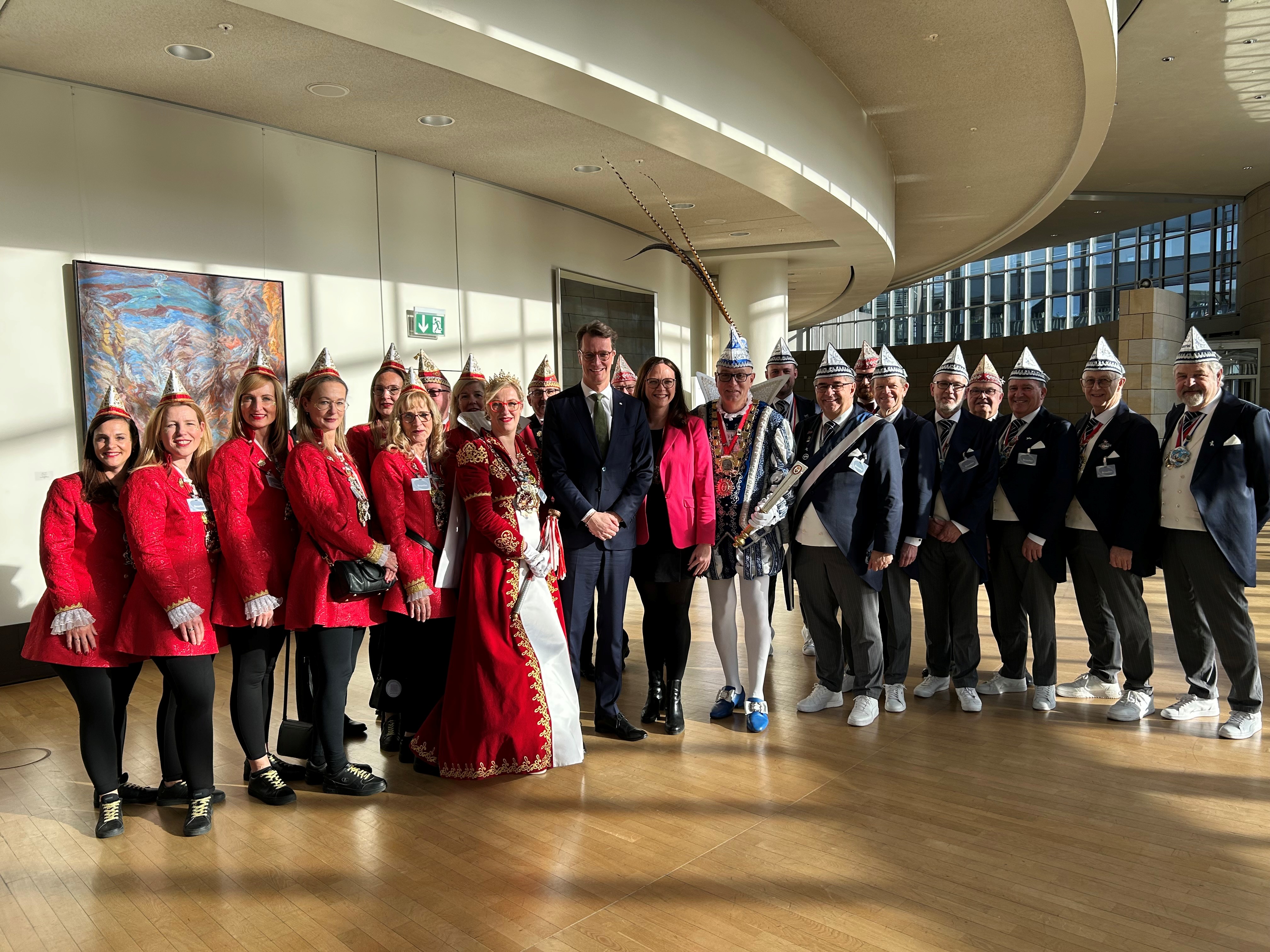 Bei einer Führung durch den Landtag erhielten die karnevalistischen Gäste Einblicke in die parlamentarische Arbeit, die Aufgaben der Abgeordneten sowie die Geschichte des Hauses. Ein besonderer Höhepunkt des Tages waren ein gemeinsames Erinnerungsfotos mit dem Ministerpräsidenten des Landes Nordrhein-Westfalen Hendrik Wüst sowie André Kuper, dem Präsidenten des Landtags.
